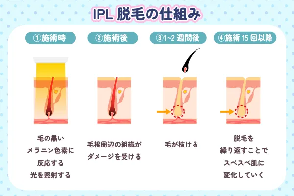 照射される光がメラニン色素に吸収されると、熱エネルギーとなって、毛根、毛乳頭、バルジ領域などにダメージを与えます。そうすると、1~2週間程度でムダ毛が自然に抜け落ちます。毛が生えてくる毛周期に合わせて複数回IPL脱毛をすることで、少しずつ毛が生えにくい状態を目指すことができます。