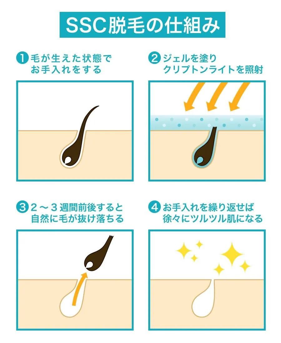 IPL脱毛やSHR脱毛とは異なるアプローチで脱毛をするのが「SSC脱毛器」です。一番の特徴は、専用のジェルを使うことです。脱毛効果がある特殊なジェルと、「クリプトンライト」という光を組み合わせて施術をします。