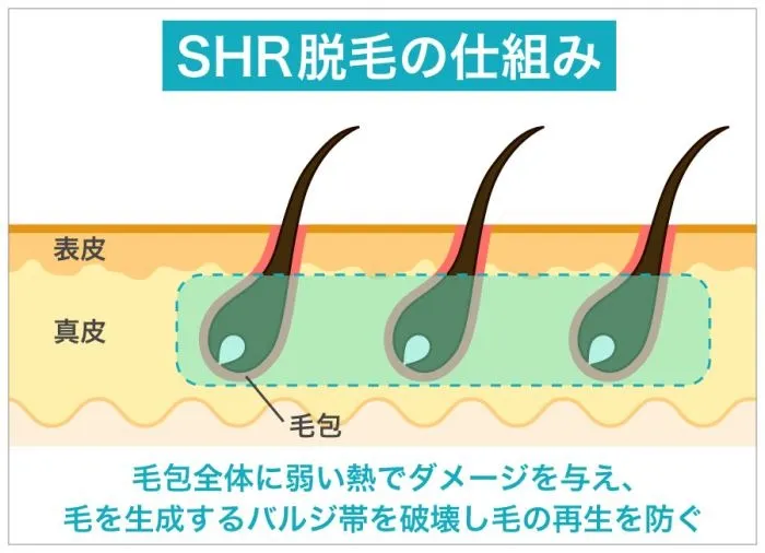 光脱毛にはIPL脱毛と特徴が異なる「SHR脱毛」があります。この脱毛器は、毛包全体に低いエネルギーの光を連続照射します。そして蓄熱させてじわじわとムダ毛の部分に熱を与えます。この熱が、発毛の指令を出すバルジ領域にダメージを与えてくれるので、結果的に毛が生えにくい状態になります。